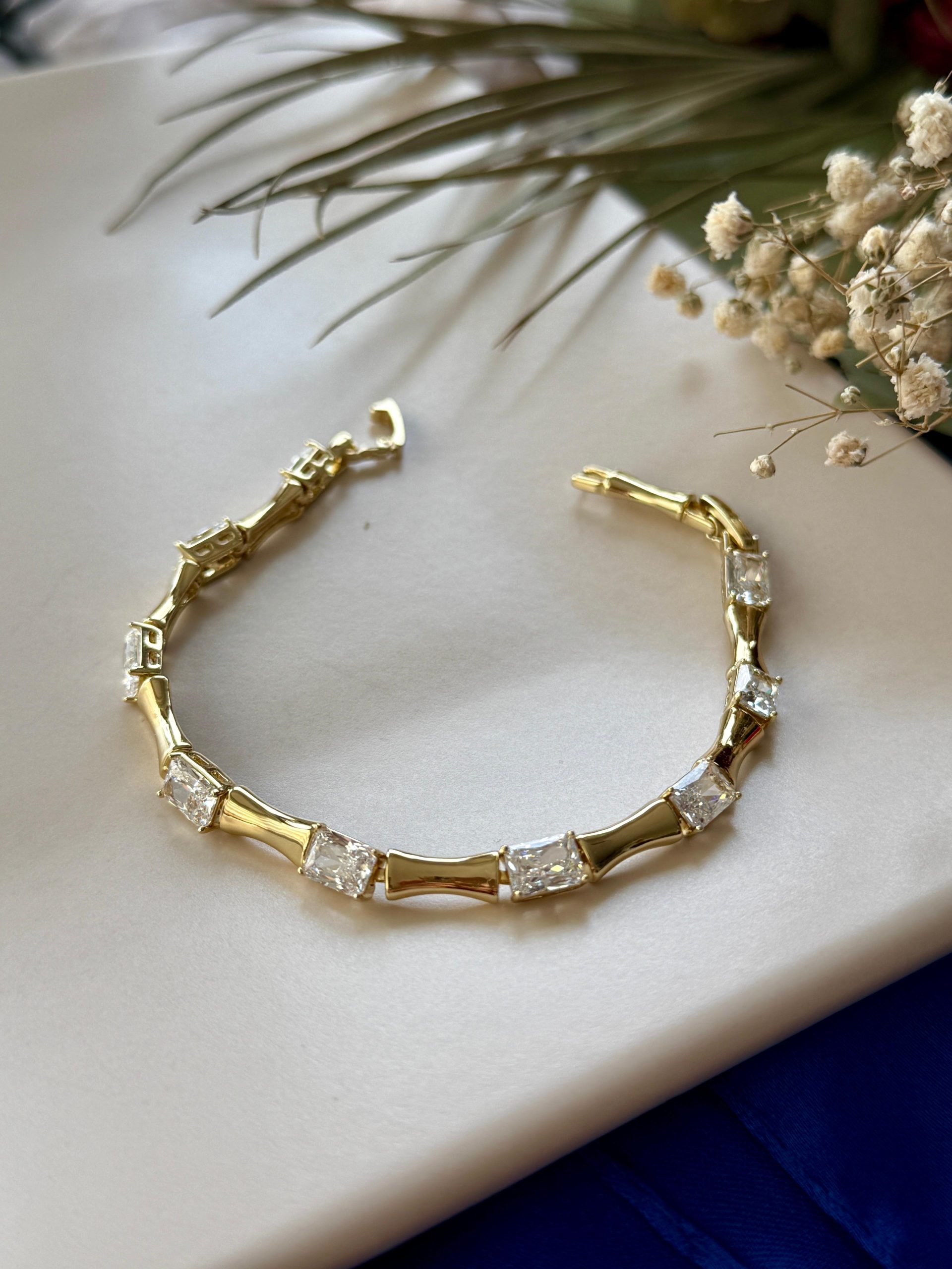 Sıralı baget taşlar ile zarif kavisli gold halkaları birleştiren bu minimalist tasarım, bileğinizde hem modern hem de çok şık bir duruş sergiler.