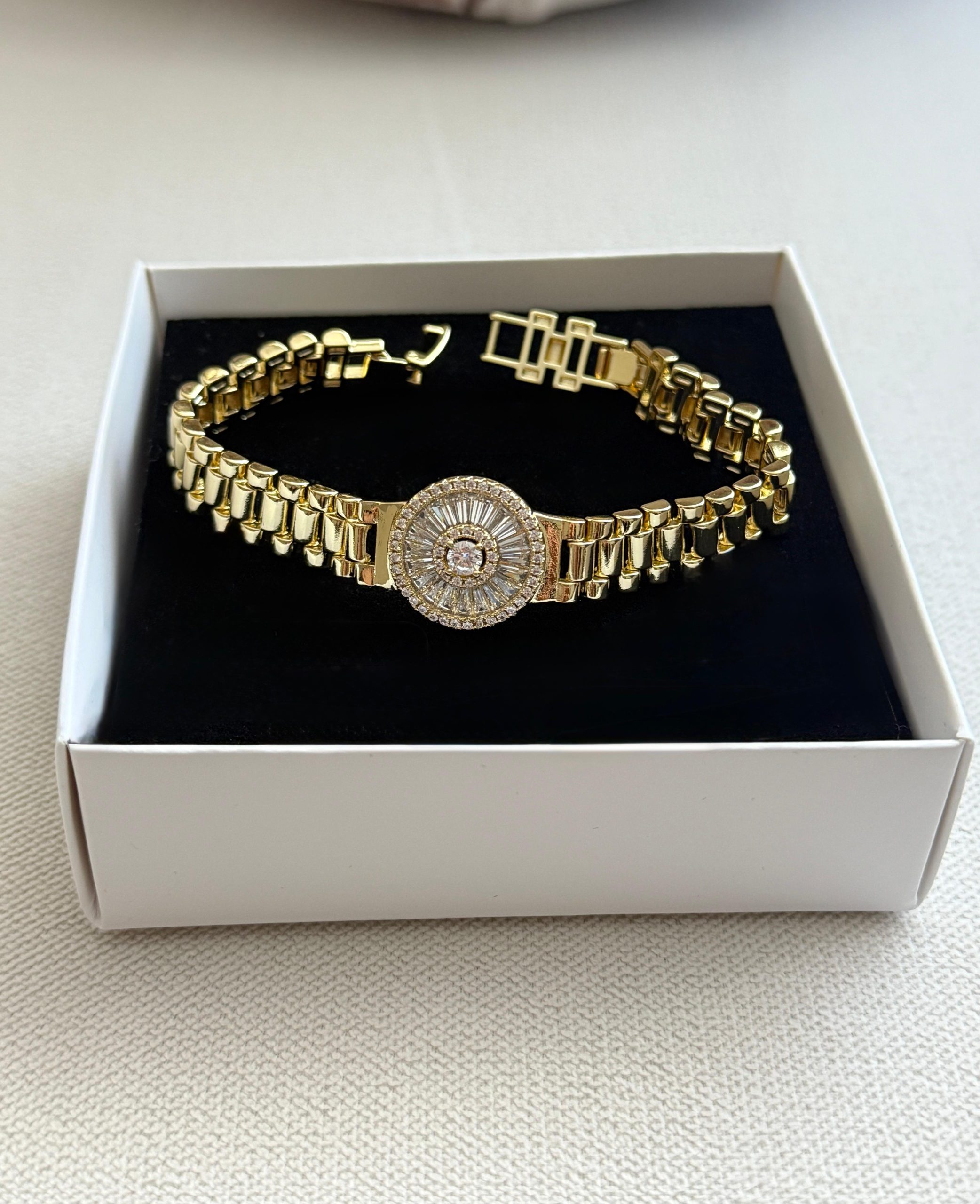Göz Alıcı Işıltı, Altın İşçiliği! Merkezdeki baget taşlı dairesel motifi klasik saat kordonuyla buluşturan bu parça, bileğinizde lüks bir duruş sergiler.